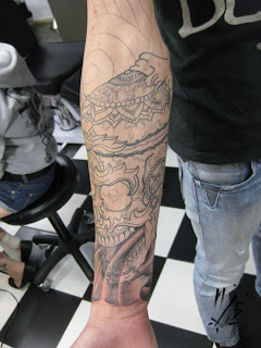 Just as we were about to start the tattoo a runaway Mercedes 4wd careened into the car park outside the shop, completely writing off 5 cars damaging 2 and leaving my car amidst the wake unharmed. unfortunately Gemma's car (the owner of the tattoo) her car was totaled. What a way to start a tattoo and definitely tattoo therapy. She handled it well and i am very happy with the end result.